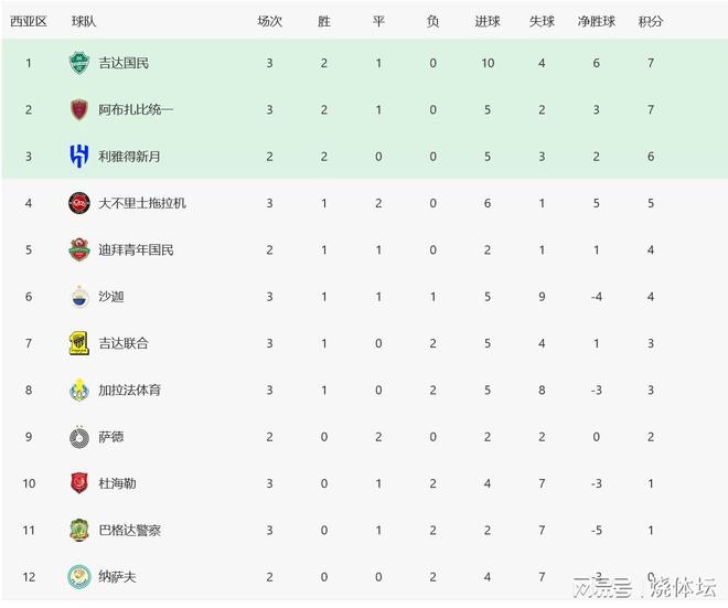 西亚区第3轮也没有打完,目前吉达国民、阿布扎比统一都是2胜1平保持不败,还有大不里士拖拉机队也是3轮不败。此外,杜海勒、巴格达警察皆是三轮不胜。